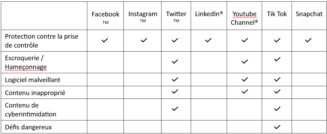 Social Media Monitoring¹ surveille vos comptes sur les sites de réseaux sociaux les plus populaires énumérés ci-dessous et vous informe de toute activité suspecte, telle que des modifications de vos paramètres de compte et des liens risqués. Elle peut également surveiller les comptes de vos enfants et vous informer de tout cyberharcèlement potentiel, de défis dangereux sur TikTok, de contenu explicite ou de discours de haine.²