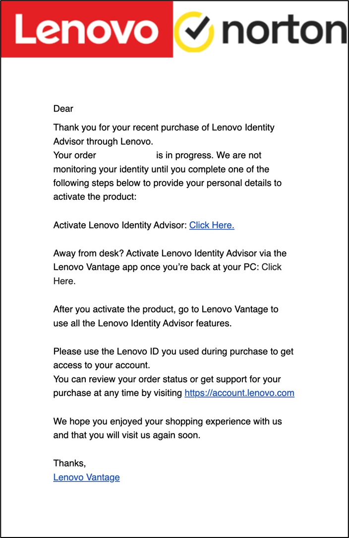 - Vous recevrez des e-mails de confirmation de commande de Lenovo et d'UDS indiquant les détails de votre commande, ainsi qu'un lien pour activer Lenovo Identity Advisor.